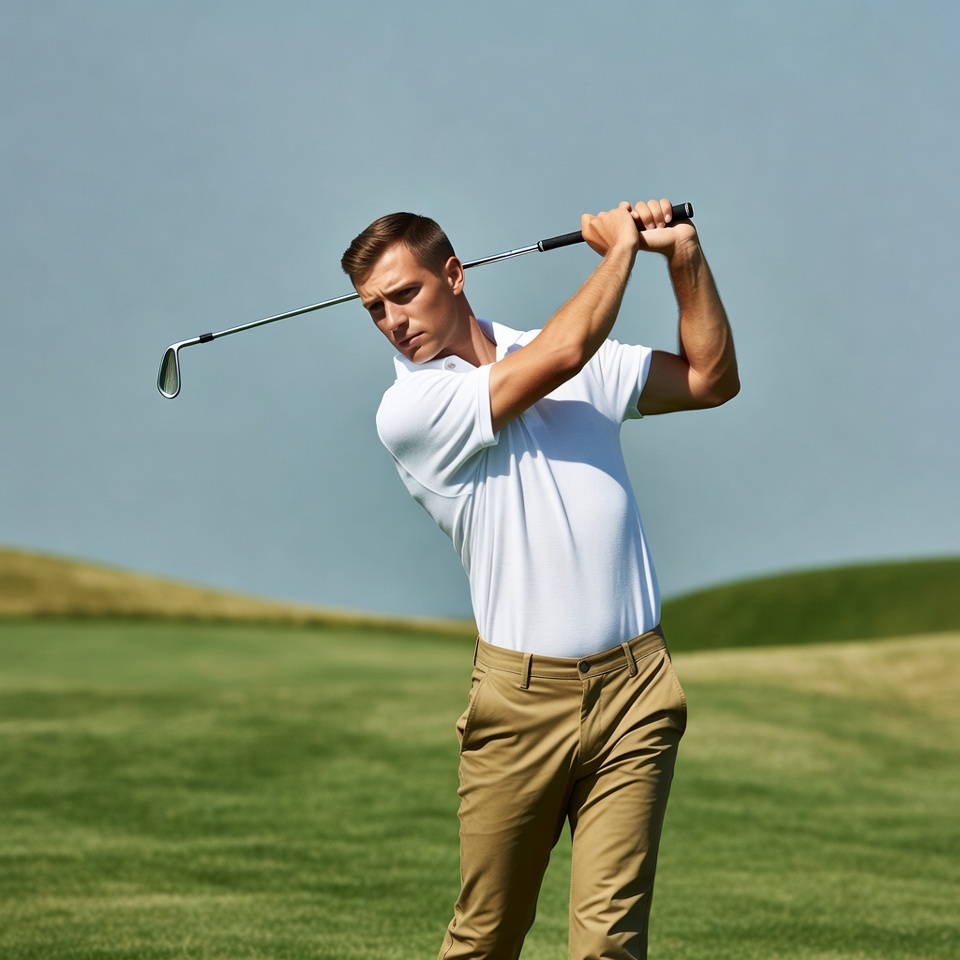 A White man with short brown hair swings a golf club mid-stroke on a green golf course. He wears a white polo shirt and khaki pants, with his body turned in dynamic motion. The background features rolling green hills under a clear blue sky.