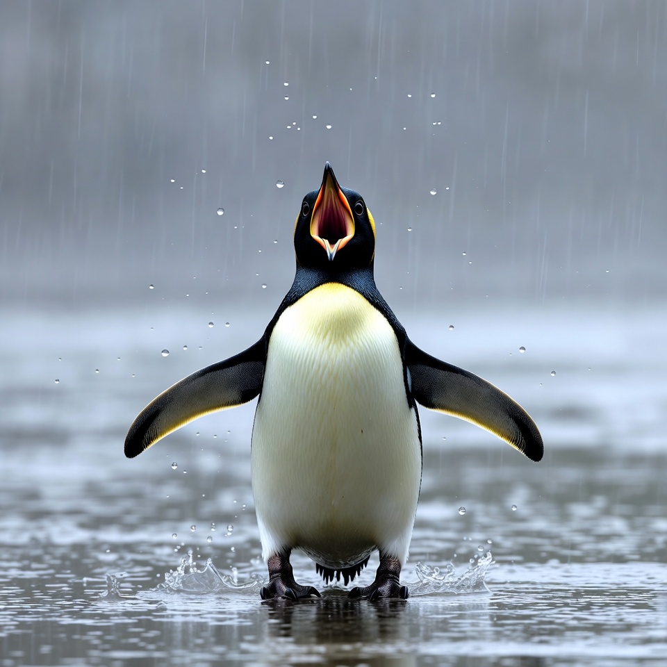 Penguin calling in rain
