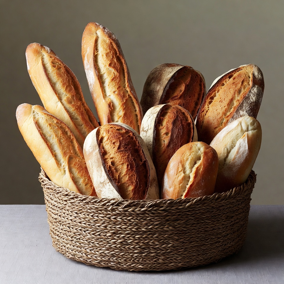 A woven basket holds an assortment of freshly baked baguettes and artisan loaves on a neutral surface. The crusty breads feature golden-brown exteriors with varied shapes and sizes. The image highlights the texture and warmth of the baked goods against a simple background.