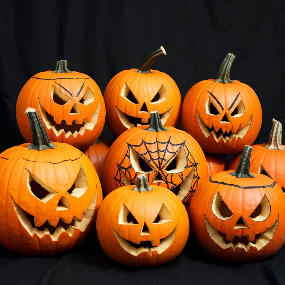 Multiple carved orange jack-o'-lantern pumpkins with spooky faces are arranged together against a solid black background. The pumpkins feature jagged eyes, grinning mouths, and one has a spider web design. They are lit from within, casting eerie glows.