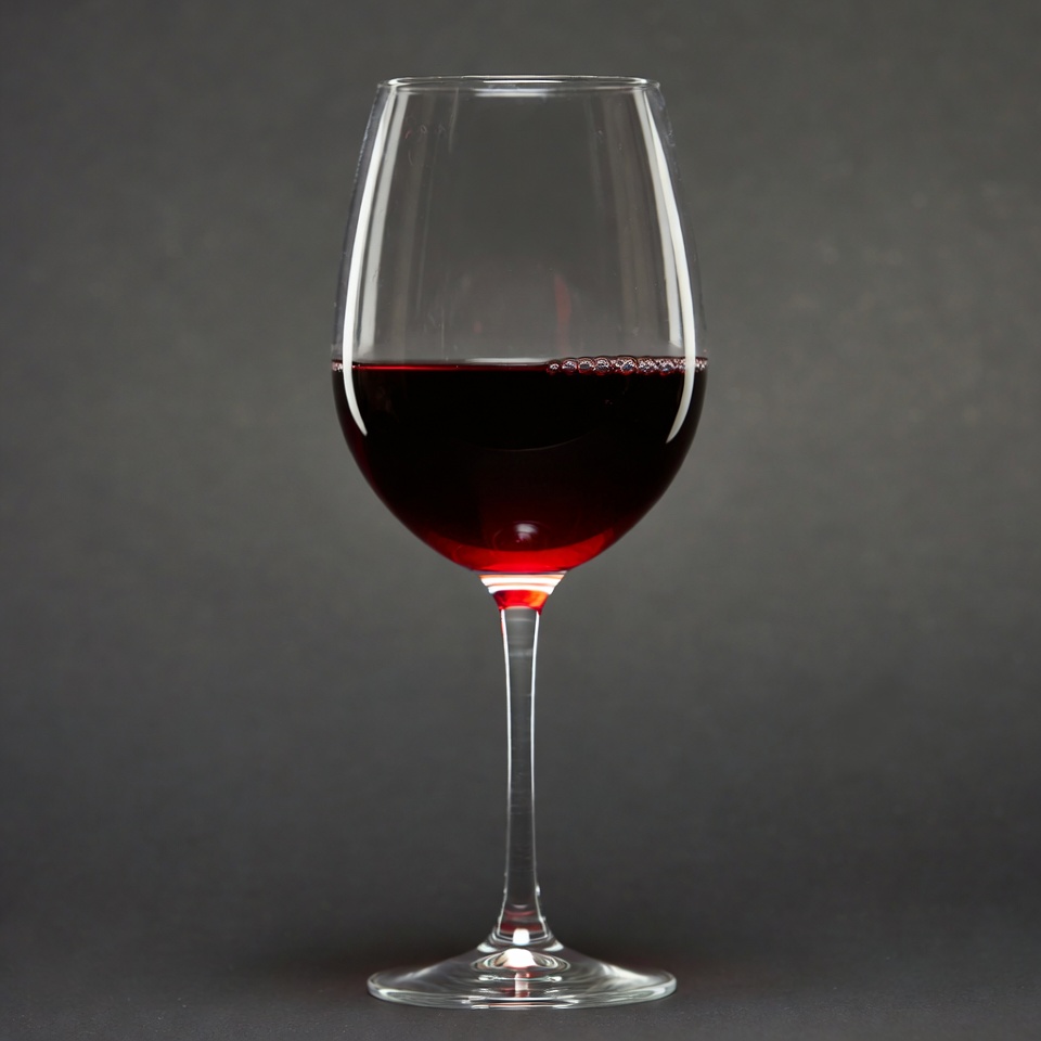 A tall wine glass filled with deep red wine stands against a dark gray background. The glass has a clear stem and bowl with subtle reflections. Bubbles are visible at the surface of the wine.