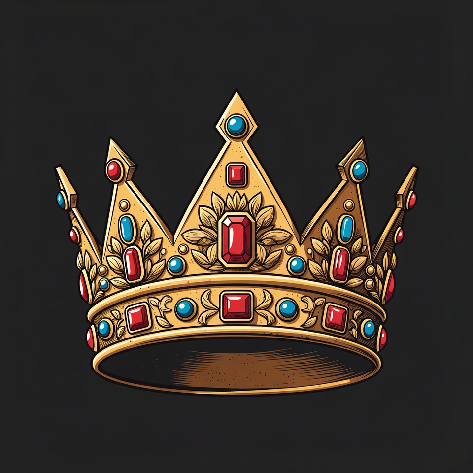 An ornate golden crown features a large central red gem flanked by smaller red and blue jewels. It has intricate gold filigree designs and pointed arches on a dark isolated background. The crown is richly detailed in an illustration style.