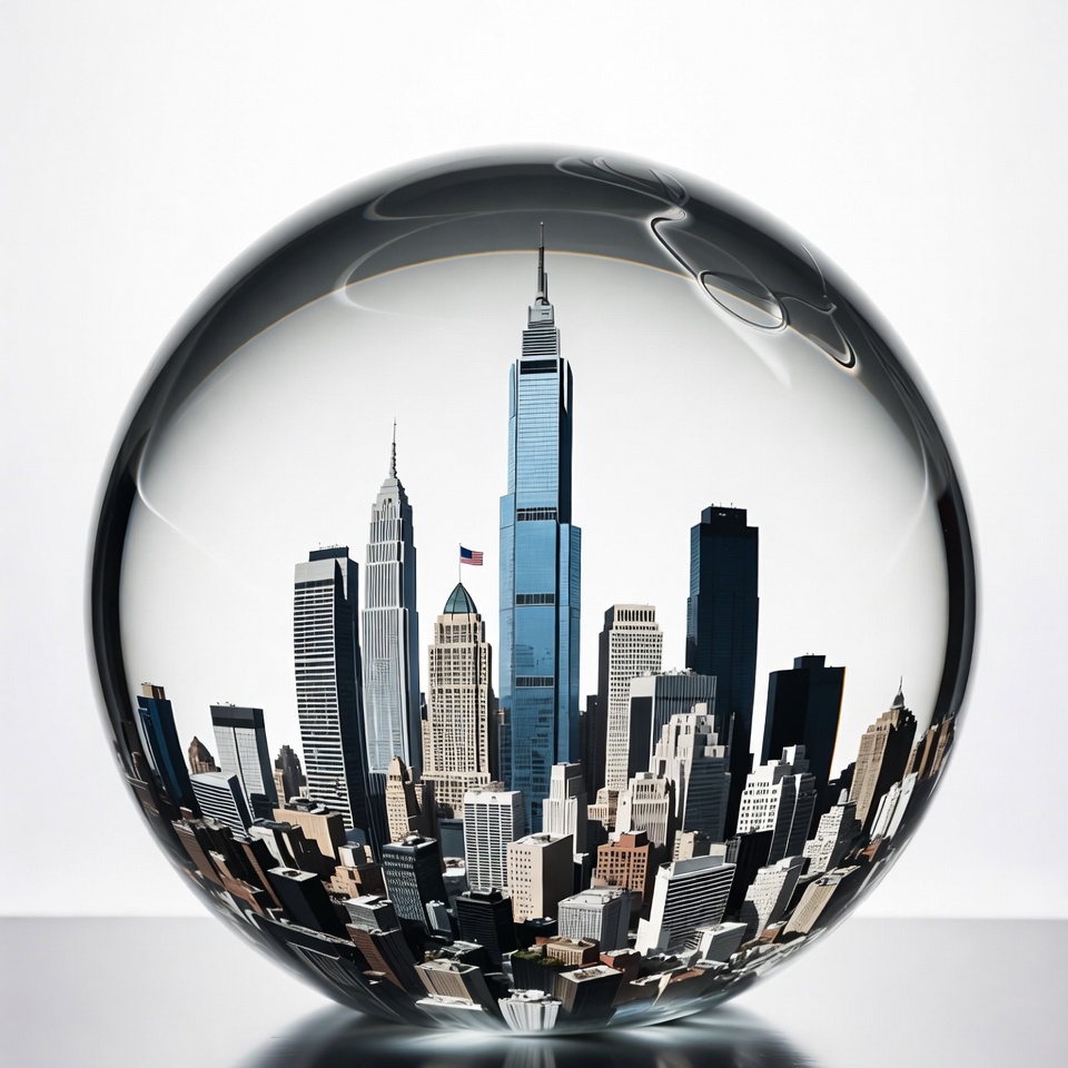 American flag, Empire State Building, NYC skyline, One World Trade Center, architecture, cityscape, crystal ball, glass globe, isolated background, miniature city, reflection, skyscrapers, urban landscape, New York City