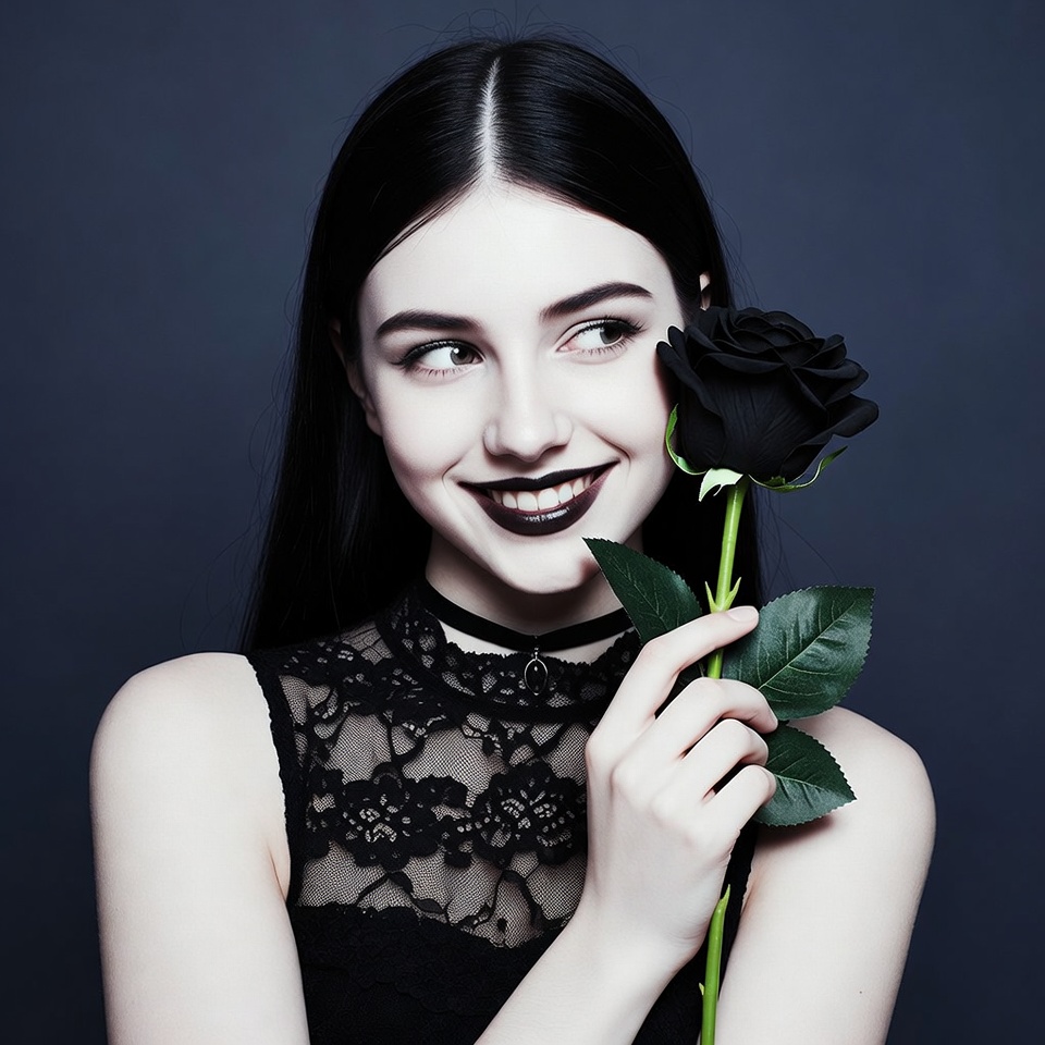White, beauty, black hair, black lipstick, black rose, choker, close-up face, dark background, dark makeup, evening wear, female, gothic style, green leaves, holding flower, lace dress, lace top, long hair, mysterious, playful expression, portrait, rose stem, smiling, young woman, woman