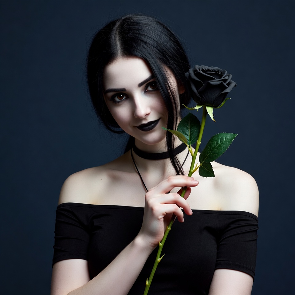 A young woman with long black hair and dark gothic makeup holds a black rose close to her face against a dark blue background. She wears a black off-shoulder top and a choker necklace. Her expression is intense with black lipstick and eyeliner.