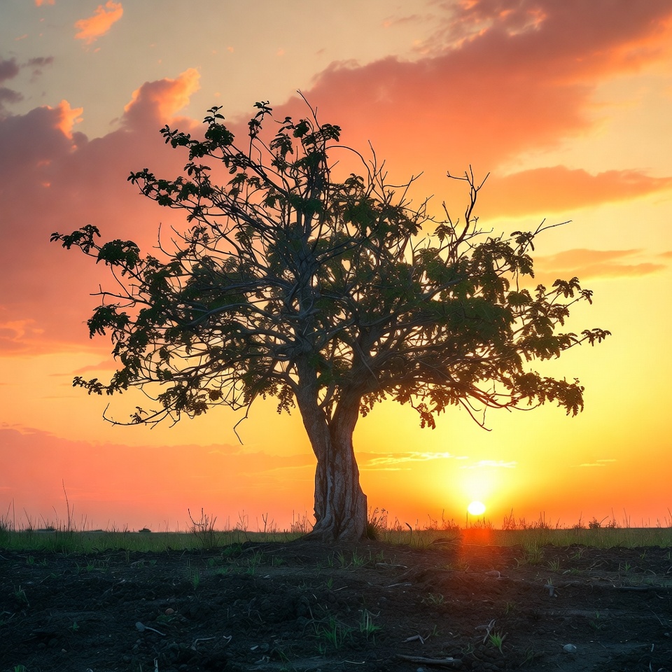 A lone tree stands in silhouette against a vibrant orange and pink sunset sky. The tree features a thick trunk and spreading branches with green leaves. It is positioned on a grassy field with the sun low on the horizon.