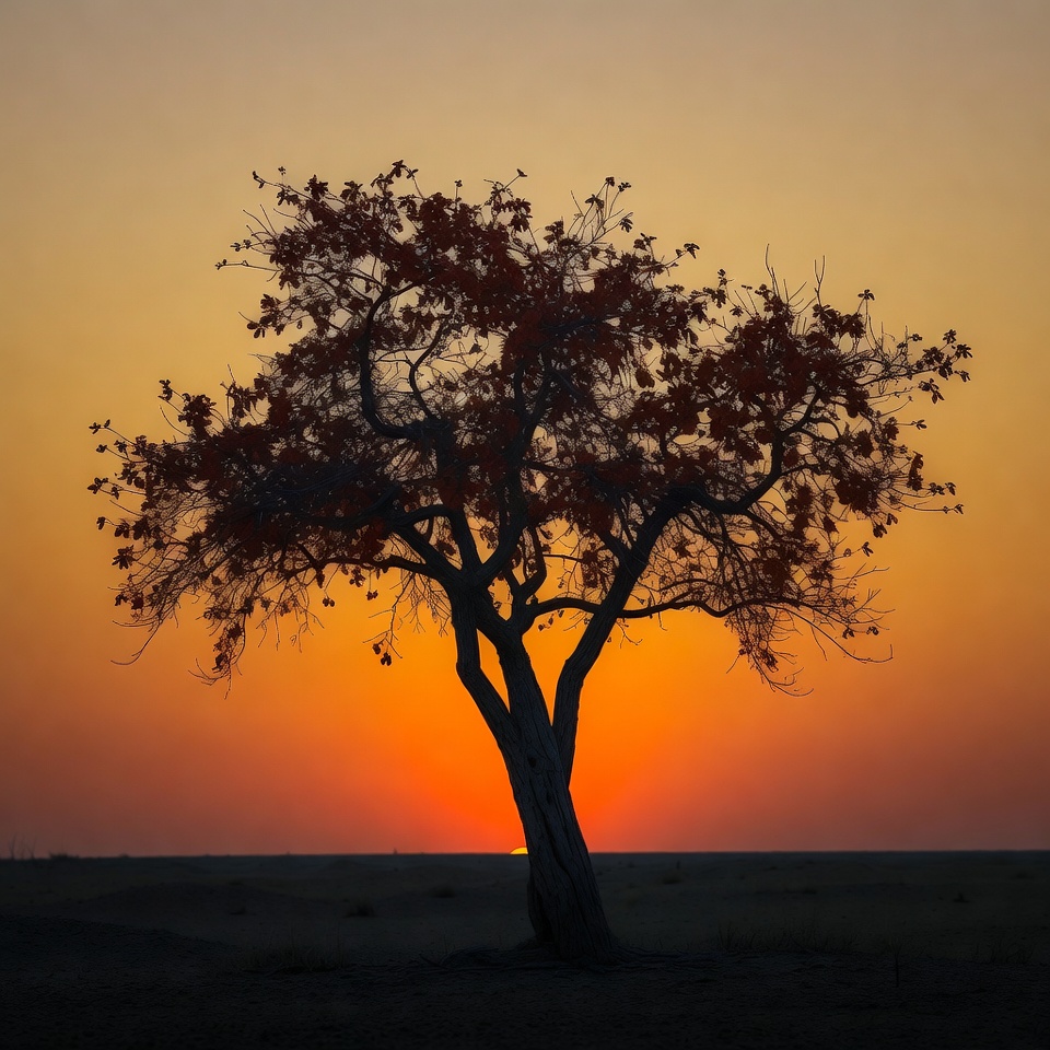 A lone tree stands in silhouette against a vibrant orange sunset sky. The sun dips below the flat horizon, casting a warm glow. Sparse branches and leaves are outlined sharply in the foreground.