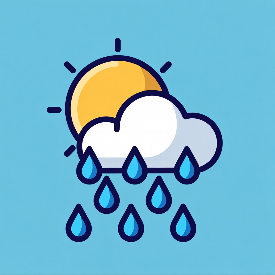A colorful flat illustration features a bright yellow sun partially obscured by a white cloud on a blue background. Blue raindrops fall from the cloud, depicting partly cloudy weather with rain. The design uses simple cartoon-style lines and vibrant colors.