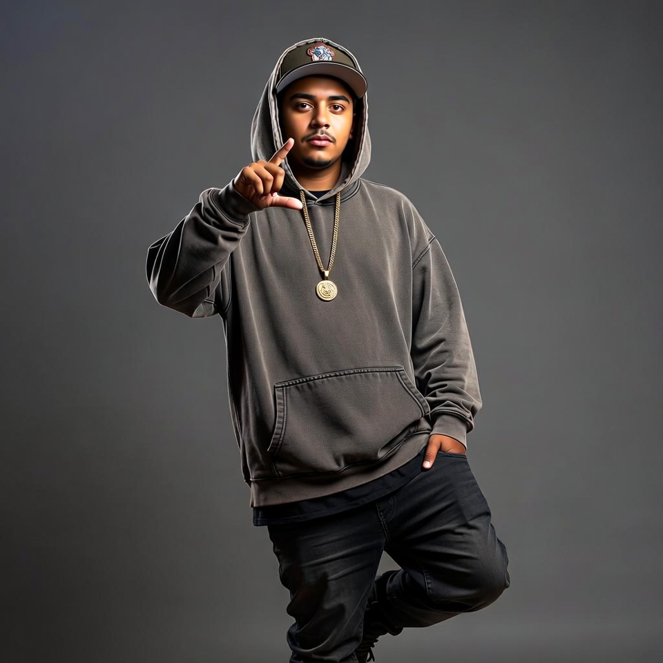 A young man with a mustache and round face wears a gray oversized hoodie, brown cap, and gold chain necklace. He stands confidently against a gray background, pointing with his index finger like a gun using his right hand. He has hands in pockets on his left side and poses with black pants.