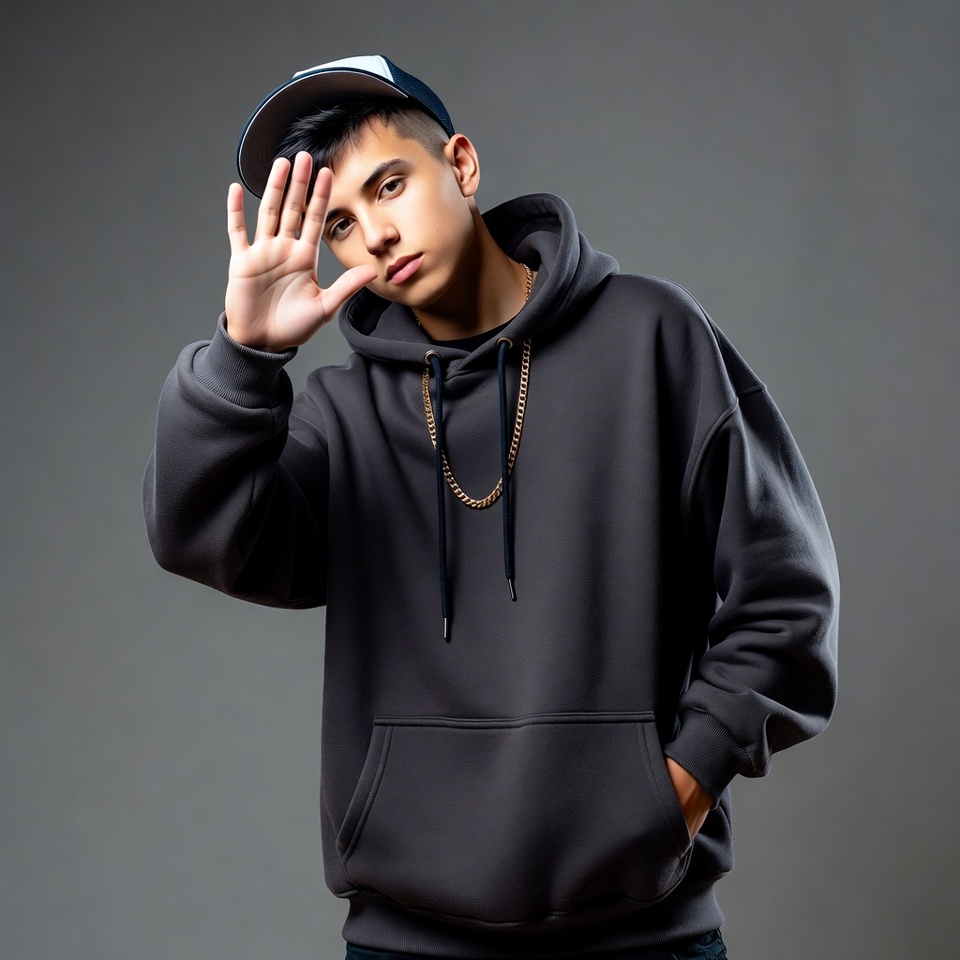 Latino, baseball cap, casual wear, cool pose, dark hair, fashion, gold chain, gray background, gray hoodie, hand gesture, hip hop, male, necklace, one person, oversized hoodie, portrait, short hair, smirking, street fashion, streetwear, trendy outfit, urban style, white cap, young man