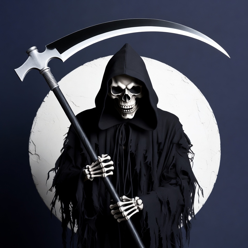 A skeletal Grim Reaper in a tattered black hooded cloak holds a large silver scythe with both bony hands. He stands against a large white full moon on a dark blue background. The figure has a menacing skull face visible under the hood.