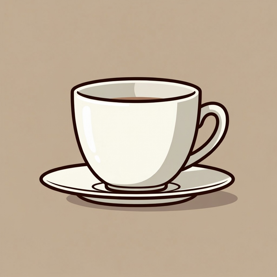 A simple illustration of a white teacup filled with brown liquid sits on a matching white saucer. The cup features a curved handle and smooth glossy surface. It is depicted on a solid beige background with subtle shadows.