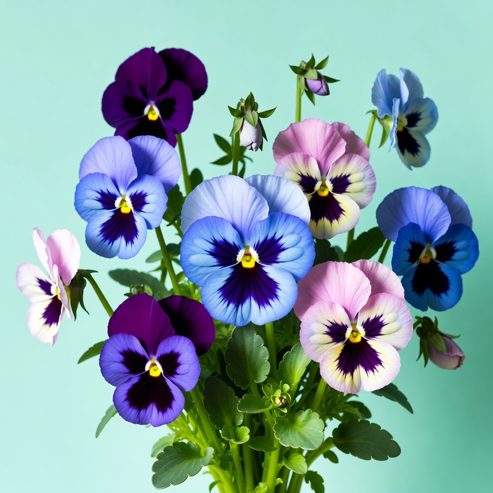 A vibrant bouquet of pansy flowers in shades of purple, blue, pink, and white is arranged with green stems and leaves. The flowers feature distinct dark centers and velvety petals. The bunch is set against a light green background.