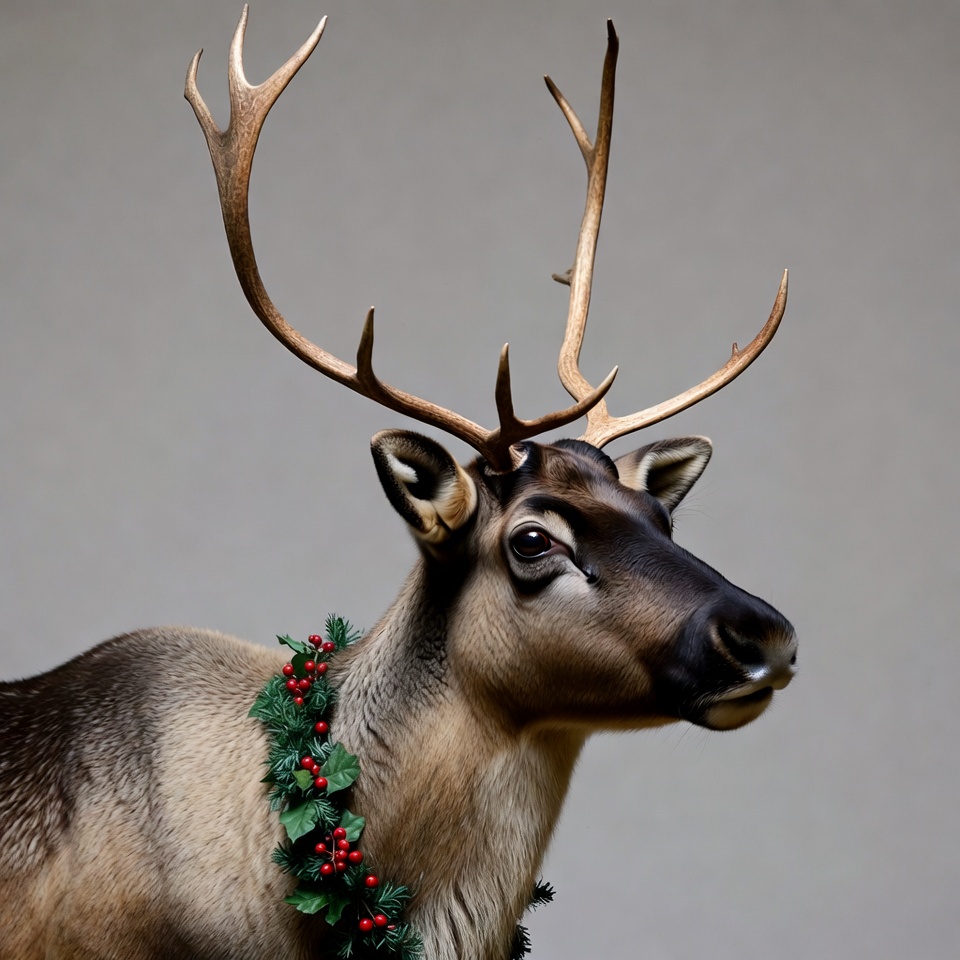 A reindeer with large antlers stands on a plain gray background. It wears a green holly wreath with red berries around its neck. The reindeer faces slightly to the side with a direct gaze at the viewer.