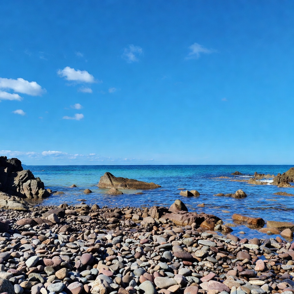 A scenic rocky beach features scattered pebbles and large boulders along the turquoise ocean shore. Clear blue sky with scattered white clouds stretches above the calm sea. Waves gently lap against the colorful rocks in the foreground.