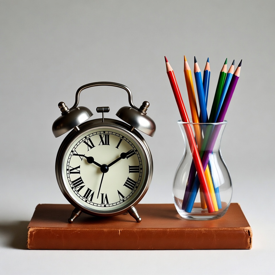 A silver alarm clock with Roman numerals sits on a brown book. Next to it stands a clear glass vase filled with colorful pencils in red, blue, green, and yellow. The items are arranged on a plain white background.