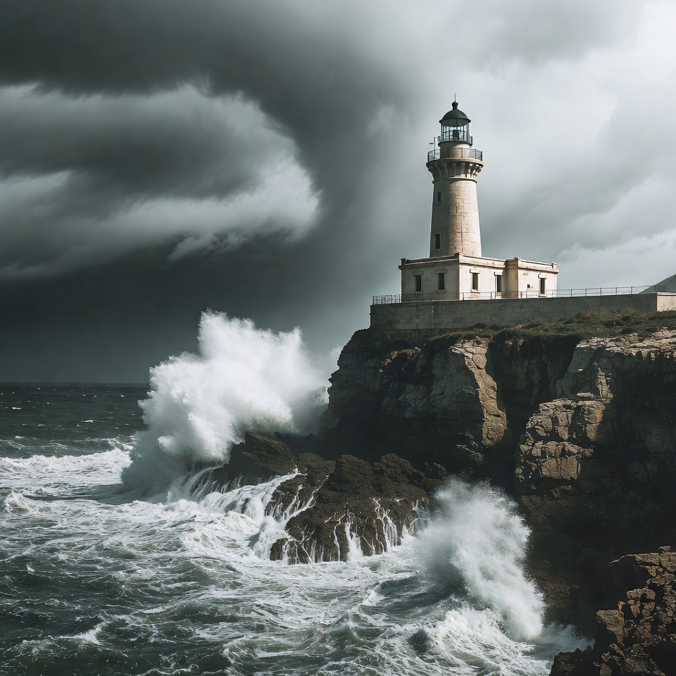 A tall white lighthouse stands on a rocky cliff overlooking the ocean. Massive waves crash against the rocks below under a dark, cloudy sky. The structure features a green dome on top and is surrounded by a stone wall.