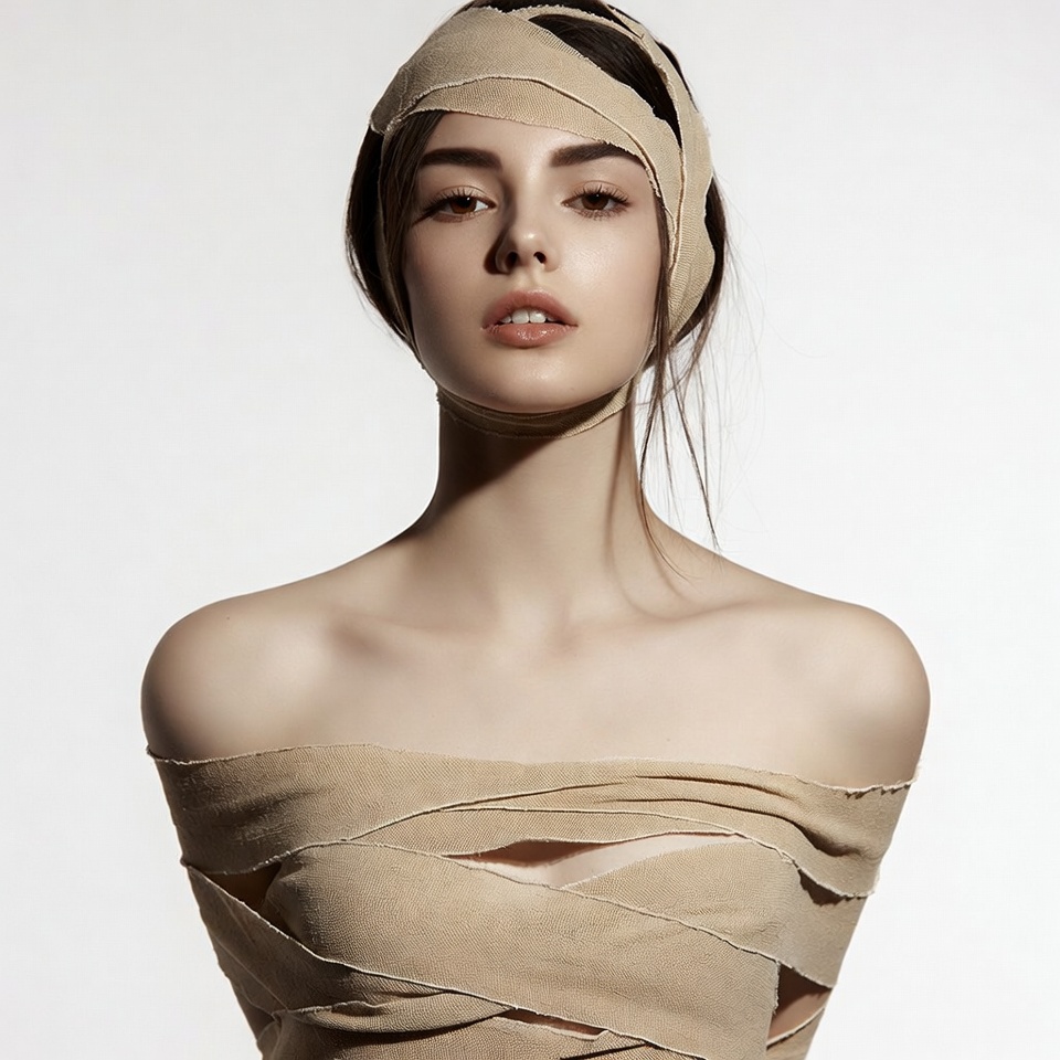 A young woman with dark hair stands against a white background, her head and upper body wrapped in beige bandages. Her face is partially exposed with subtle makeup and a neutral expression. The bandages are loosely draped over her shoulders, creating a mummy-like appearance.