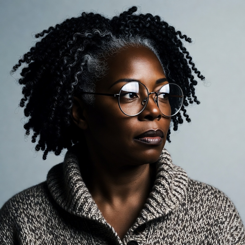 black hair, closeup face, curly hair, dark skin, eyewear, fashion portrait, female, glasses, gray hair, gray sweater, headshot, mature woman, neutral expression, portrait, round glasses, silver streaks, studio portrait, turtleneck sweater, woman, African-American woman