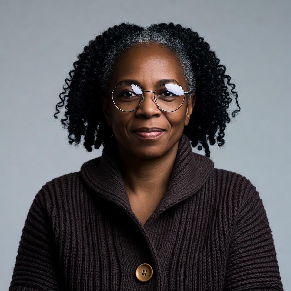 An African-American woman with curly gray hair smiles gently at the camera. She wears round glasses and a brown cardigan sweater with wooden buttons. The portrait is set against a plain gray background.