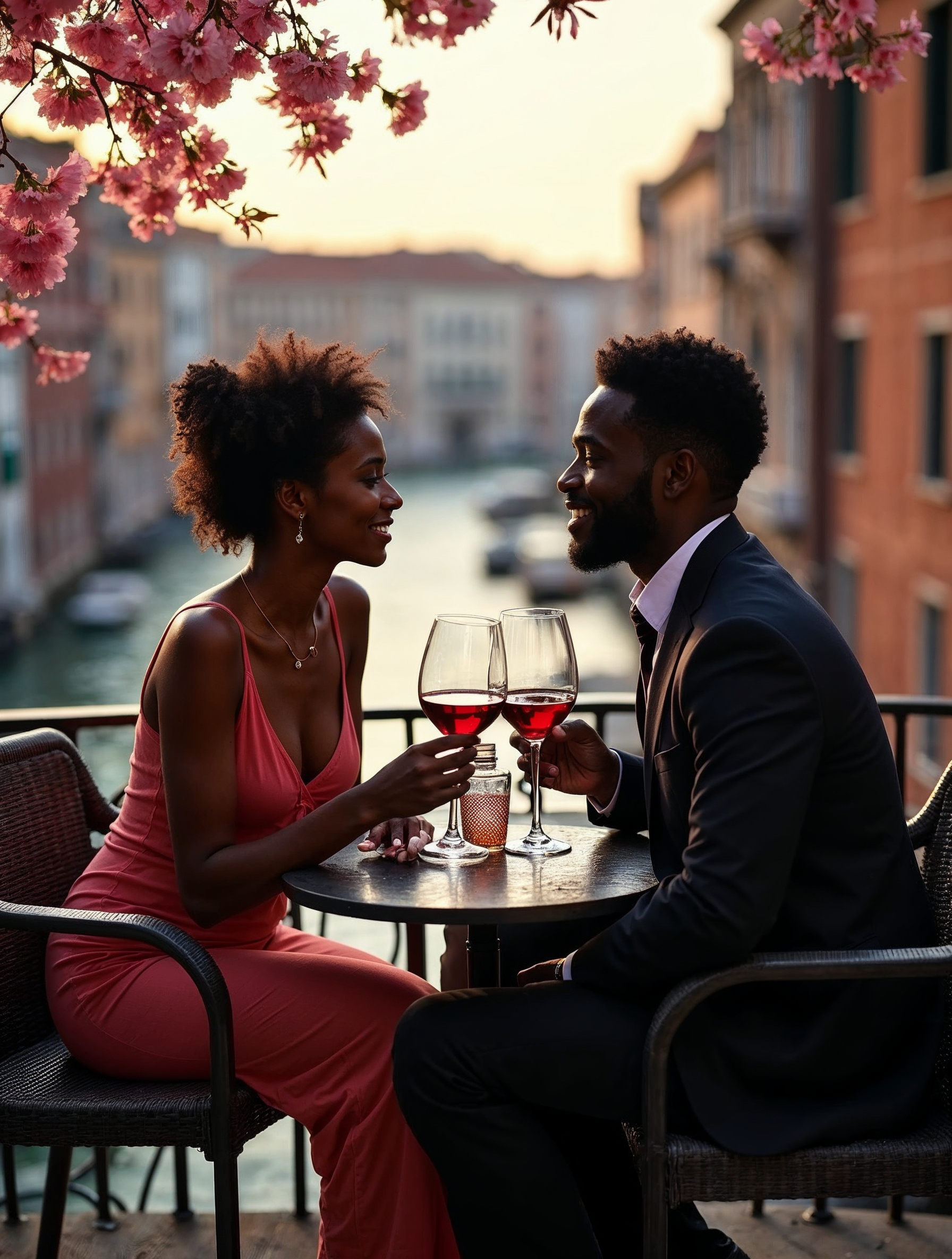 Black man, Black woman, Italian architecture, Venice canal, balcony, black suit, cherry blossoms, cityscape, couple drinking, elegant attire, evening light, formal wear, gondolas, interracial couple, outdoor table, pink flowers, red dress, red wine, romantic dinner, sunset, toasting, vacation scene, water view, wine glasses, African-American couple