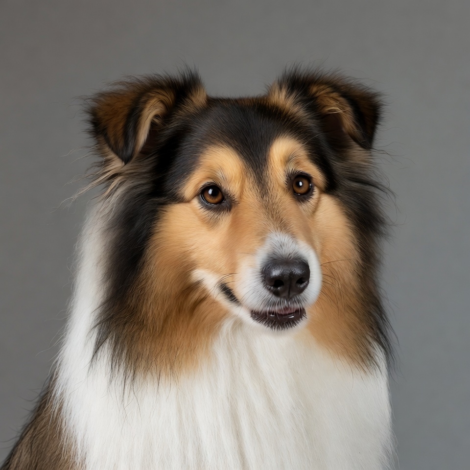 A fluffy collie dog with black, tan, and white fur stares directly at the camera. Its expressive brown eyes and smiling mouth are prominent in the headshot. The dog is centered against a plain gray background.