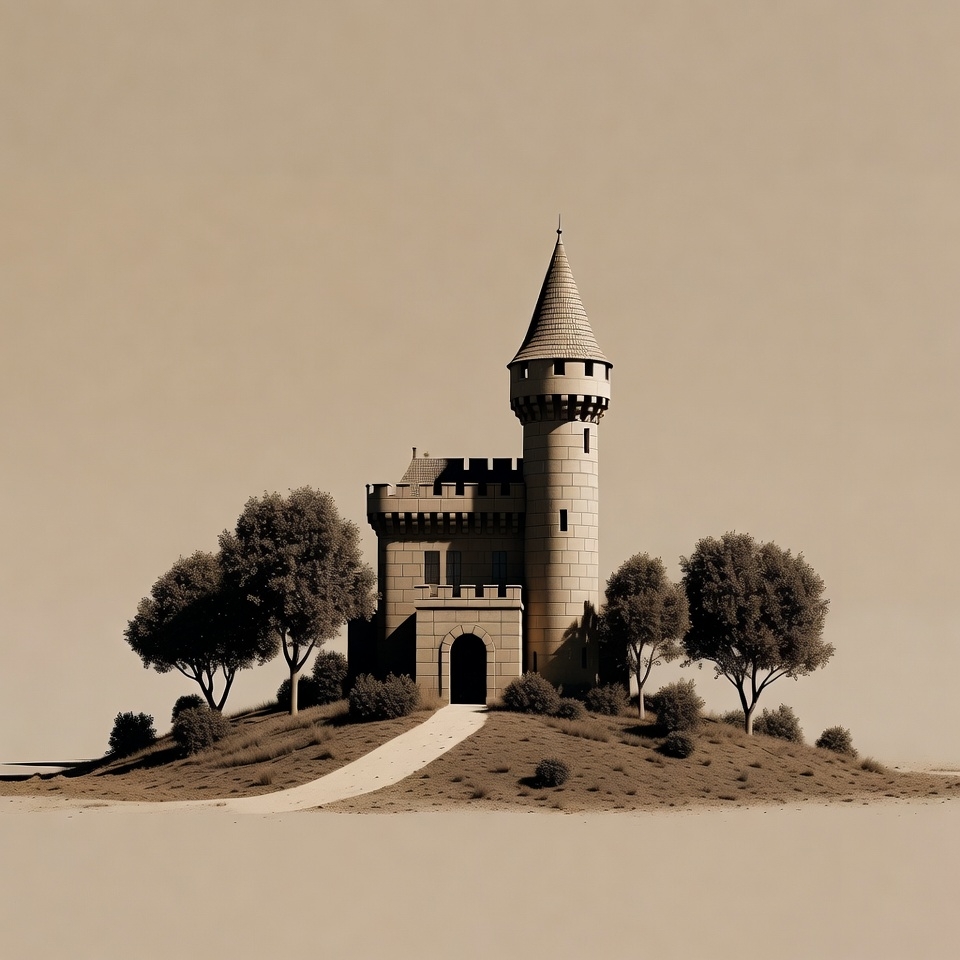 A 3D rendered medieval castle with tall cylindrical towers and a conical spire sits atop a small grassy hill surrounded by trees. A stone pathway leads to the arched entrance of the castle. The scene features a sepia-toned, isolated background.