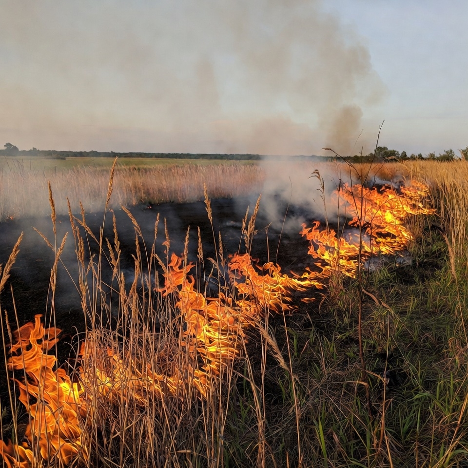 burning grass, burning reeds, controlled burn, dry grass, field, field fire, fire line, fire spread, flames, grassland, hazy sky, nature, orange flames, outdoors, prairie, reeds, smoke, smoke plume, tall grass, wildfire, grass fire