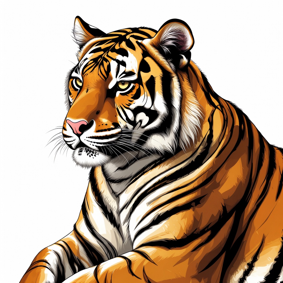 animal, big cat, black stripes, clipart, digital art, furry, graphic, illustration, isolated, mammal, orange tiger, pink nose, sitting tiger, stripes, vector art, whiskers, white background, wild animal, yellow eyes, tiger