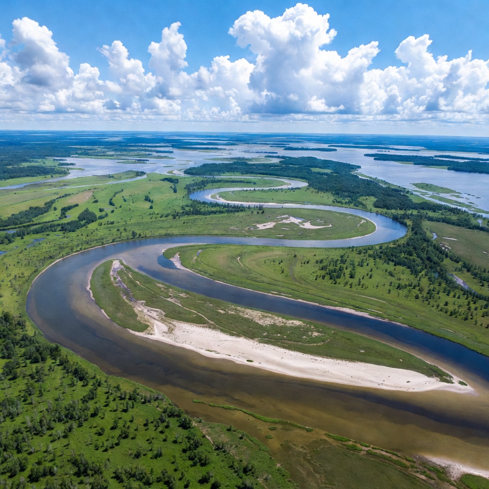 Aerial photograph captures a winding river snaking through lush green wetlands and marshes. Fluffy white clouds dot the bright blue sky above the expansive watery terrain with sandy islands and grassy banks. The vibrant green vegetation contrasts with the dark river waters.