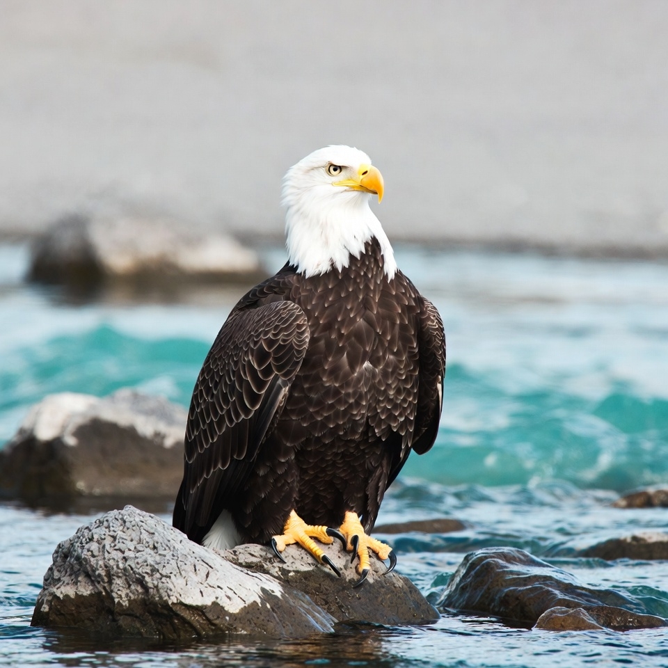 A majestic bald eagle with white head and yellow beak stands perched on a gray rock beside a turquoise river. Its dark brown feathers are detailed on wings and body, with yellow talons gripping the stone. Gray rocks and flowing water form the natural background.