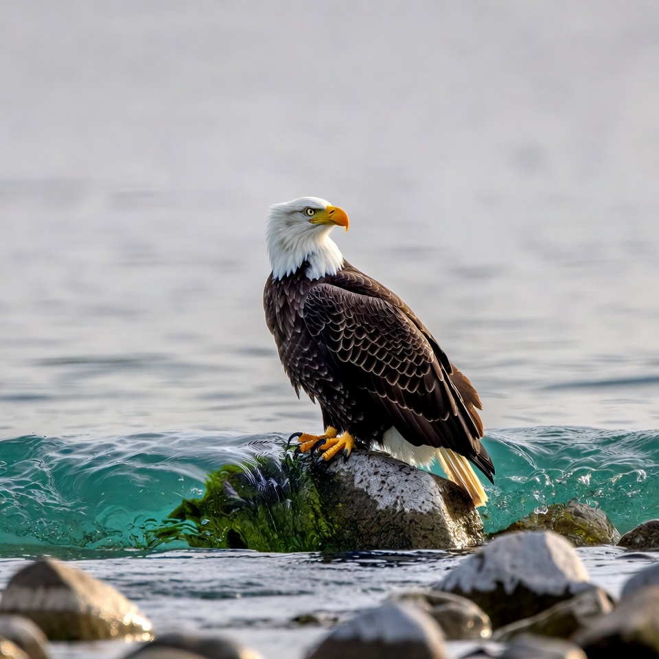 A majestic bald eagle with white head, yellow beak, and dark brown body stands perched on a mossy rock. It gazes intently with sharp yellow eyes amid gentle turquoise waves and scattered rocks. The background features a calm watery expanse.