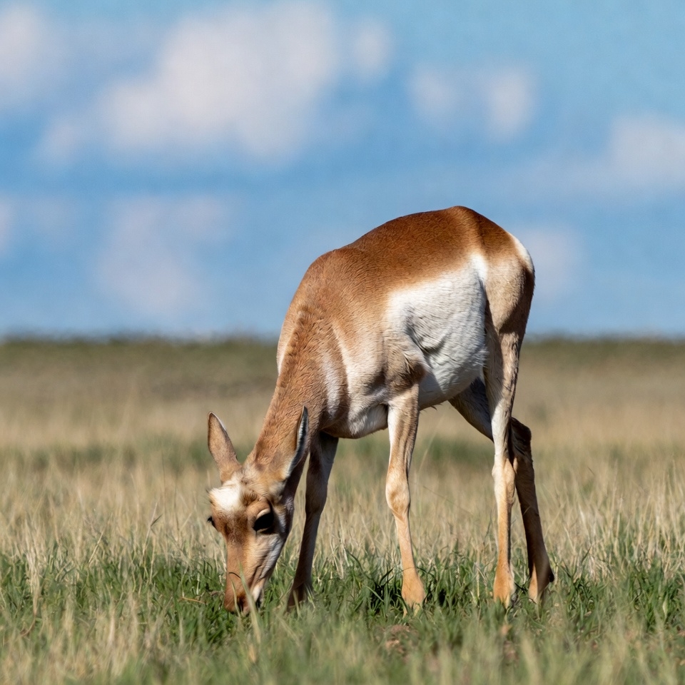 animal, antelope, blue sky, brown fur, clouds, fauna, field, grass, grassland, grazing, horns, isolated background, mammal, nature, outdoors, prairie, savanna, steppe, white belly, wild animal, wildlife, pronghorn