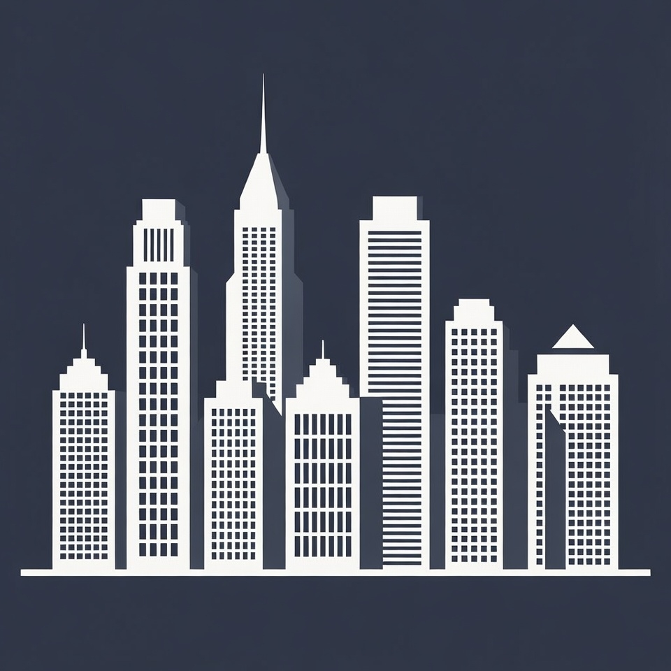 A minimalist white silhouette of a city skyline features multiple tall skyscrapers and buildings against a dark navy background. The buildings vary in height and architectural style, with pointed spires and flat roofs. The design is simple and flat, resembling vector clipart.