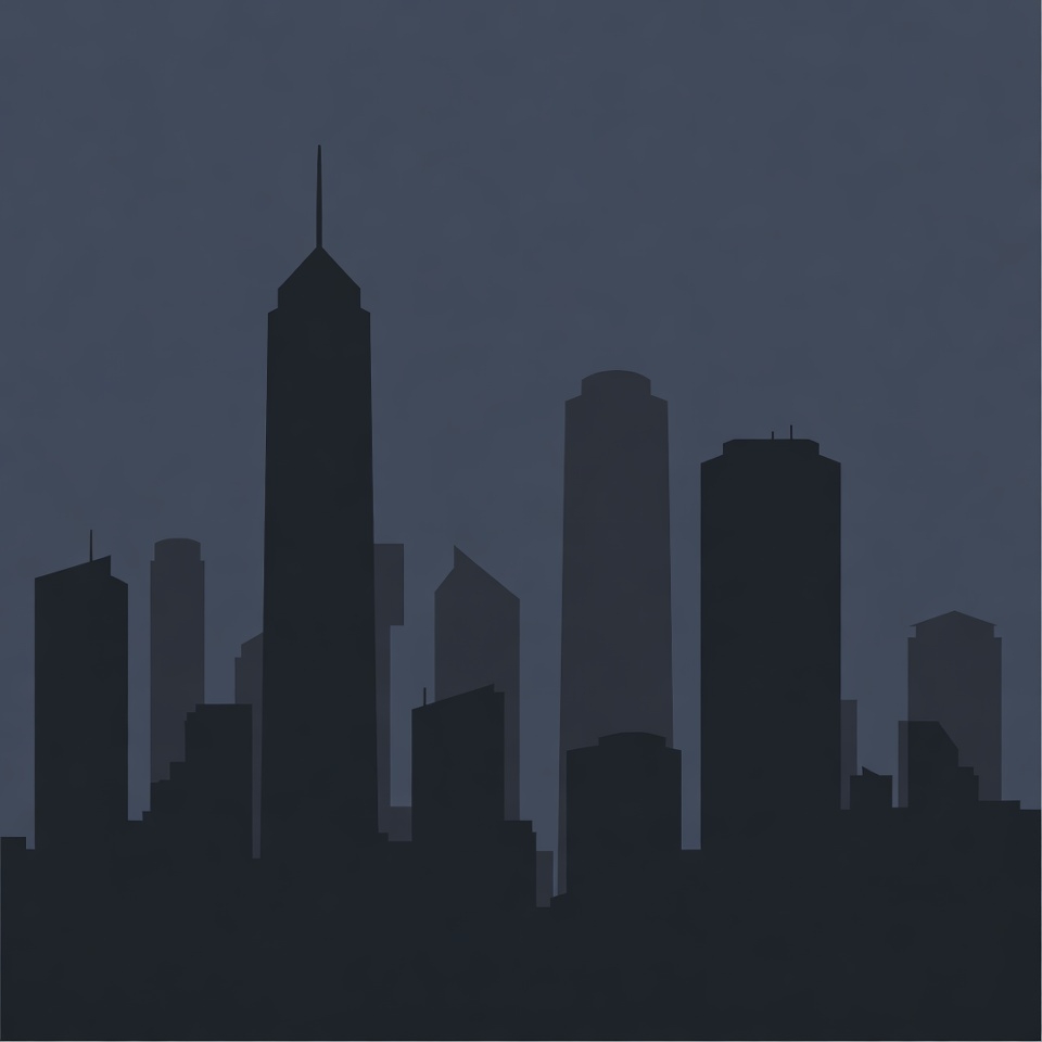 A dark silhouette of a modern city skyline features tall skyscrapers against a navy blue background. The central building is a prominent high-rise tower surrounded by various angular and curved high-rises. The image is a simple vector illustration with no additional details or colors.