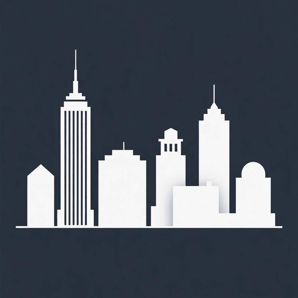 A minimalist white silhouette of the New York City skyline features iconic tall buildings including the Empire State Building. The buildings are outlined against a solid dark navy background. The design is simple and clean with smooth curves and sharp edges.