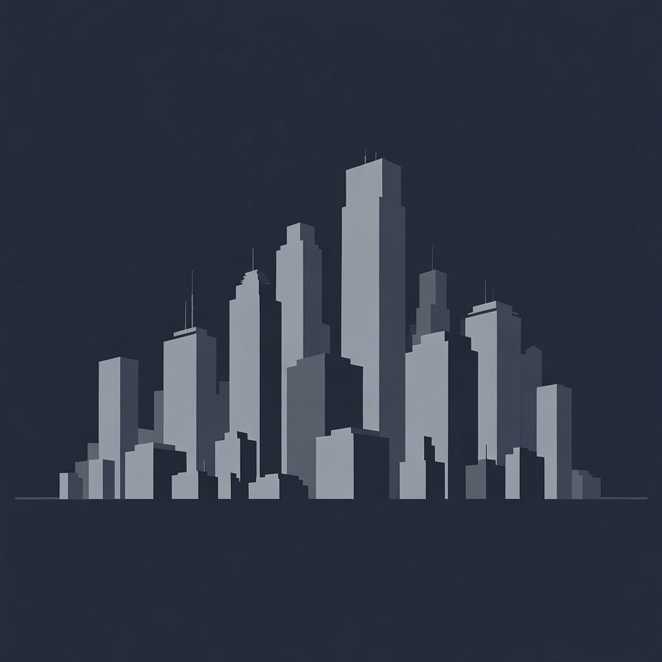 A minimalist silhouette of a city skyline features numerous tall skyscrapers in varying heights. The buildings are rendered in shades of gray against a dark navy background. The design emphasizes clean lines and geometric shapes with no visible details on the structures.