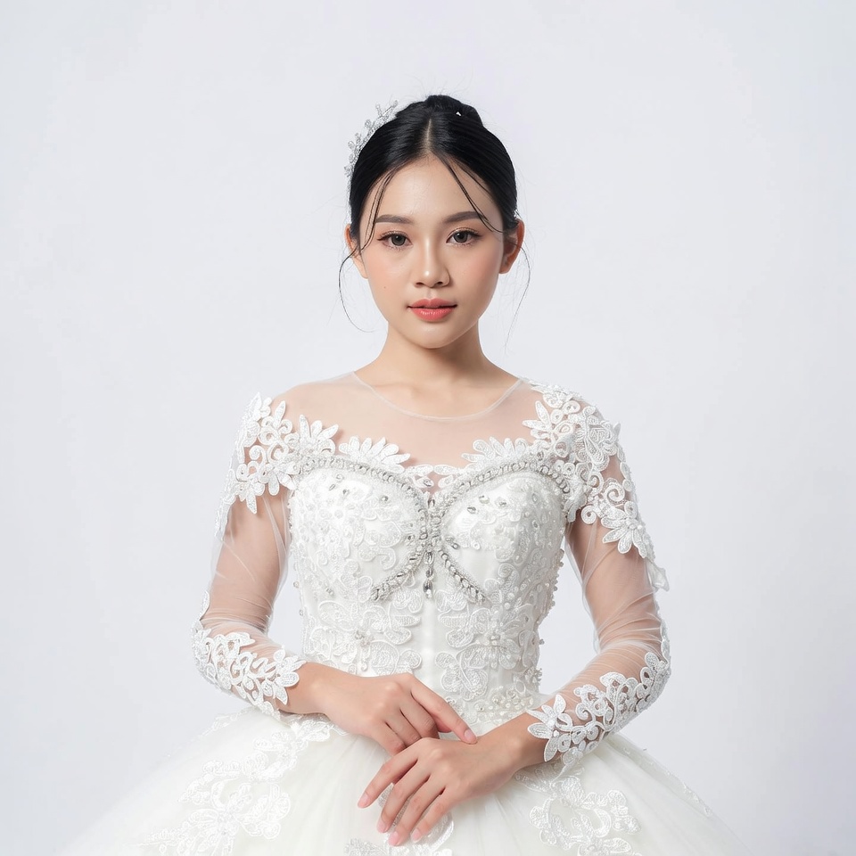 Asian woman, beaded bodice, black hair, bridal gown, bride, elegant dress, floral lace, full skirt, isolated background, lace dress, long sleeves, portrait, sheer fabric, smiling woman, updo hairstyle, wedding dress, wedding fashion, white gown, woman, young bride, Asian bride