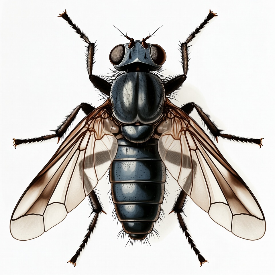 A detailed illustration of a black fly with large compound eyes and translucent wings is centered on a white background. The fly's body is dark blue-black with fuzzy legs extended outward. Fine hairs and wing veins are visible in this realistic digital artwork.