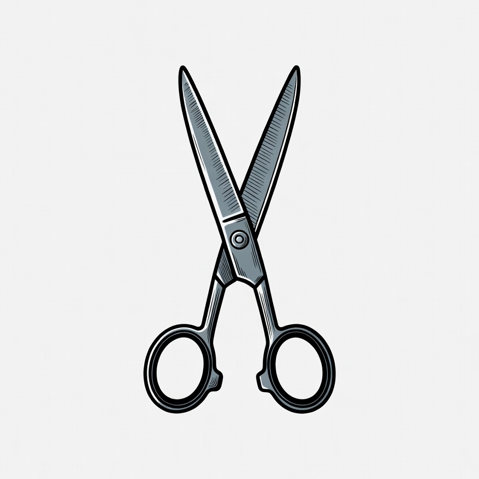 A detailed line art illustration of a pair of open scissors on a white background. The scissors feature sharp silver blades and black handles with finger holes. The design has a hand-drawn, sketch-like style.