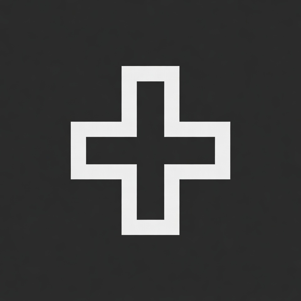 A bold white cross symbol is centered on a solid black background. The cross features thick outlines and a clean, minimalist design. It stands out sharply against the dark backdrop.