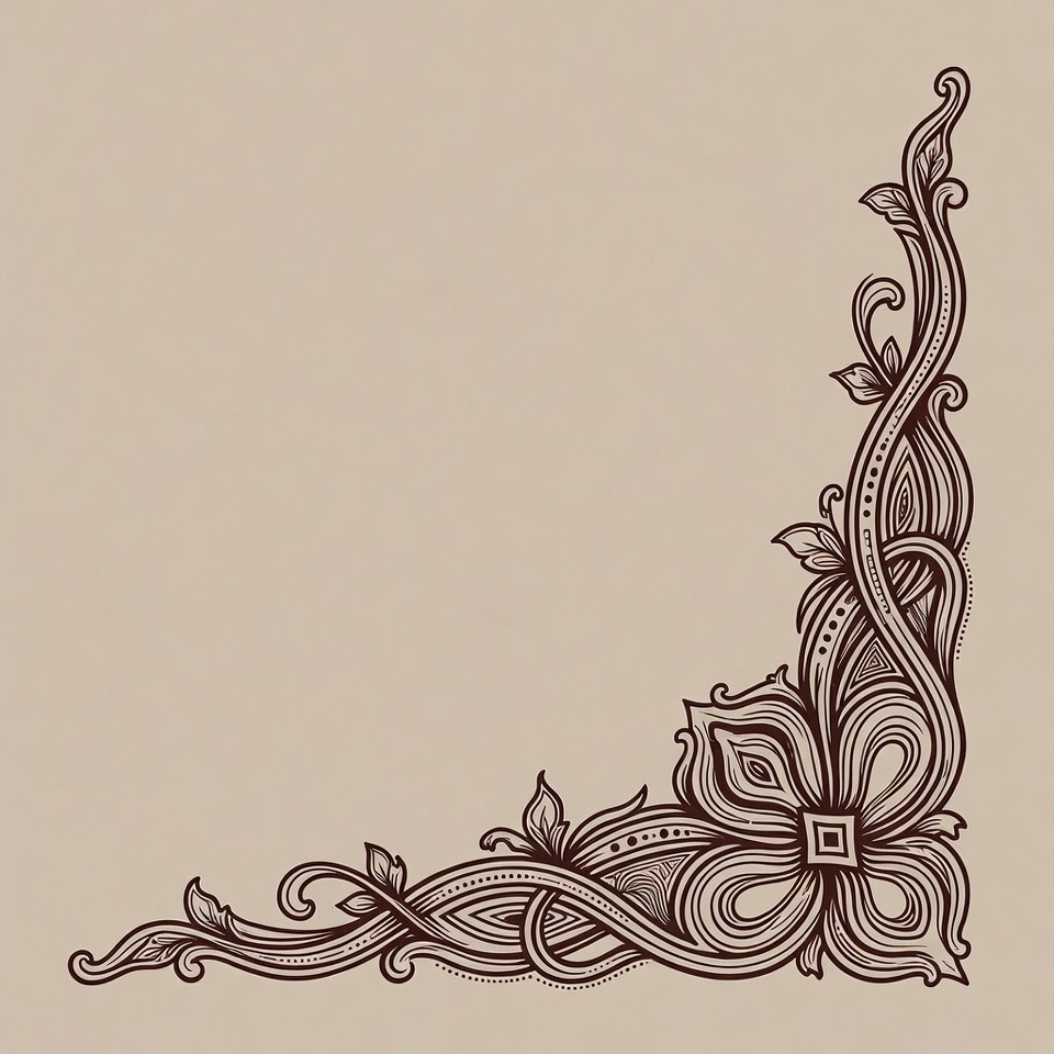 artistic border, artistic corner, beige background, botanical illustration, brown lines, clipart border, corner design, curved lines, decorative border, decorative vine, detailed pattern, doodle art, elegant design, floral swirl, flower cluster, flower ornament, foliage design, graphic element, isolated design, leaf motif, line art, ornamental flower, ornate corner, swirl pattern, vector style, vine illustration, vintage border, floral border