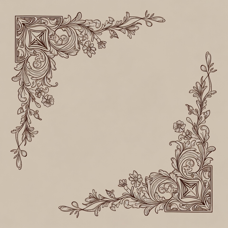 baroque style, beige drawing, clipart, corner design, decorative border, elegant frame, filigree design, floral motif, flowers, graphic element, illustration, isolated background, leaves, line art, ornate frame, swirl pattern, vector art, vines, vintage ornament, floral border