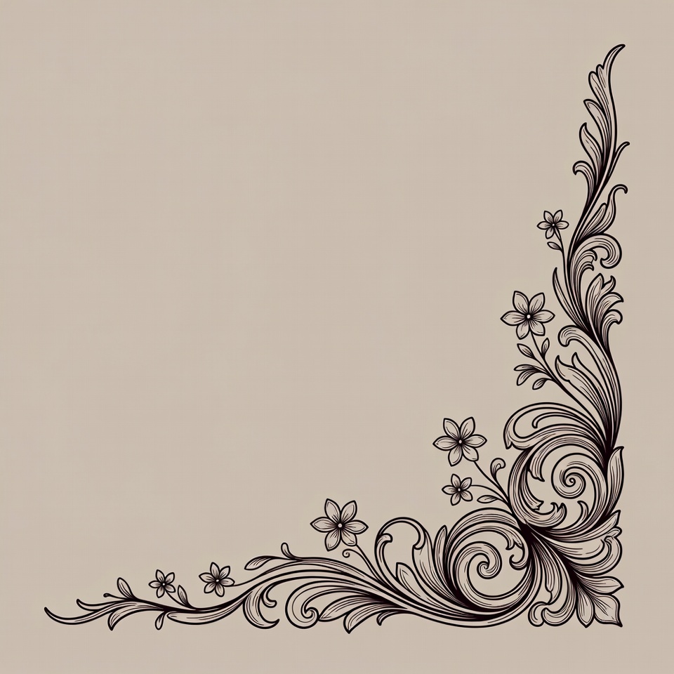 A detailed black line art illustration of swirling vines and small flowers forms an ornate corner border. The design features elegant curls and delicate petals against a beige background. It is positioned in the bottom-right corner with intricate flourishes extending outward.