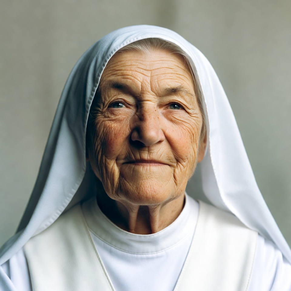 An elderly woman with wrinkled skin and gray hair wears a traditional white nun's habit and veil. She gazes directly at the camera with a calm expression against a plain gray background. Her attire includes a white collar and scapular.