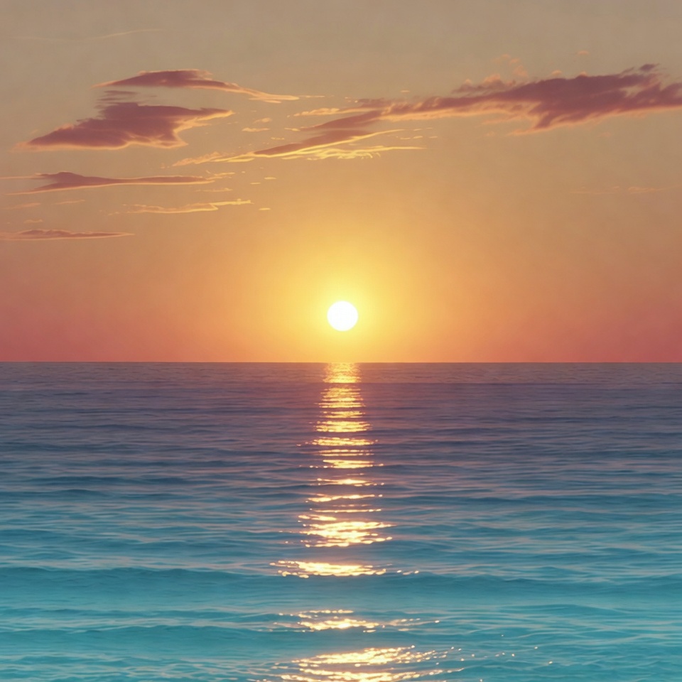 A vibrant sunset features a bright orange sun descending toward the horizon over calm ocean waters. The sun's reflection creates a golden path across the rippling sea surface. Pink and orange clouds fill the sky above the water.