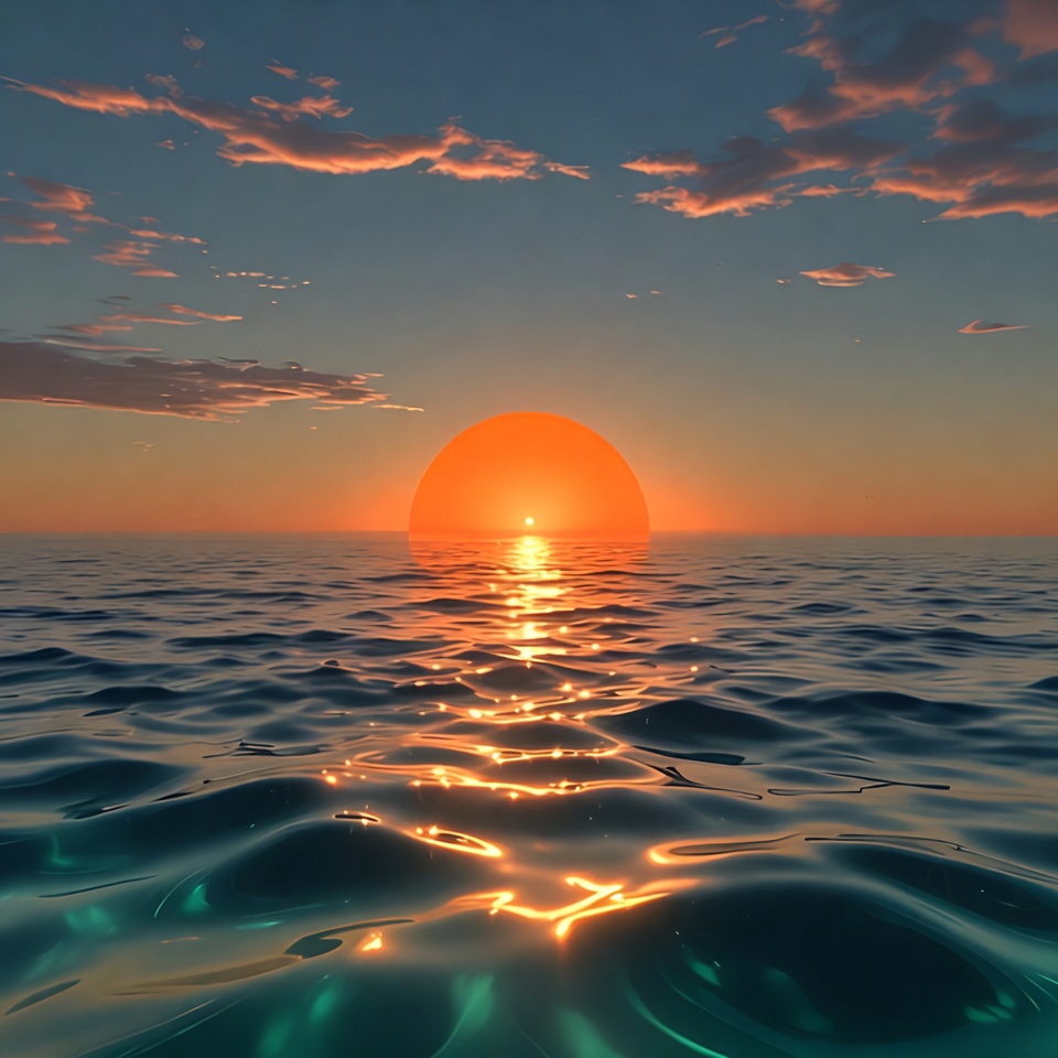 blue sky, calm sea, clouds, digital art, dusk, evening, golden light, horizon, illustration, nature, ocean, orange sun, reflection, scenery, sea, seascape, sky, sun, vibrant colors, water, waves, sunset