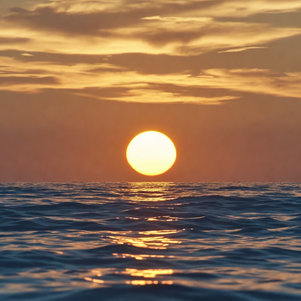 A bright orange sun sits low on the horizon above a calm sea. The sky features layered orange and yellow clouds reflecting warm hues. Gentle waves ripple on the water surface with the sun's golden reflection.
