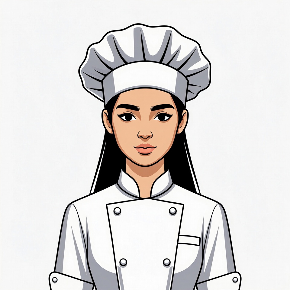 Asian, avatar, cartoon, chef uniform, clipart, double-breasted jacket, female, illustration, isolated background, kitchen chef, long black hair, professional chef, smiling, vector art, white chef hat, woman, chef