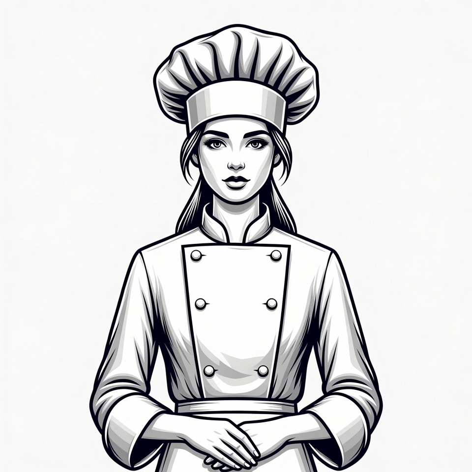 A detailed black and white line art illustration of a young woman dressed as a chef stands frontally on a white background. She wears a tall chef's hat, double-breasted chef's jacket with buttons, and has long hair tied back. Her hands are clasped together in front of her.